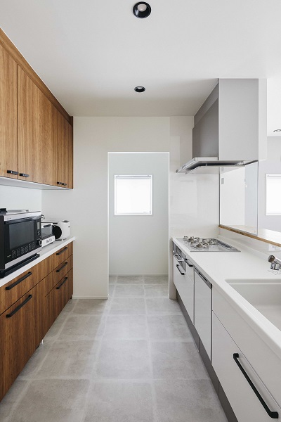 家具や造作、建具の色も床材と同系色にまとめ、統一感を出しています。壁面にはワークスペースを造作し、家事効率を向上させています。