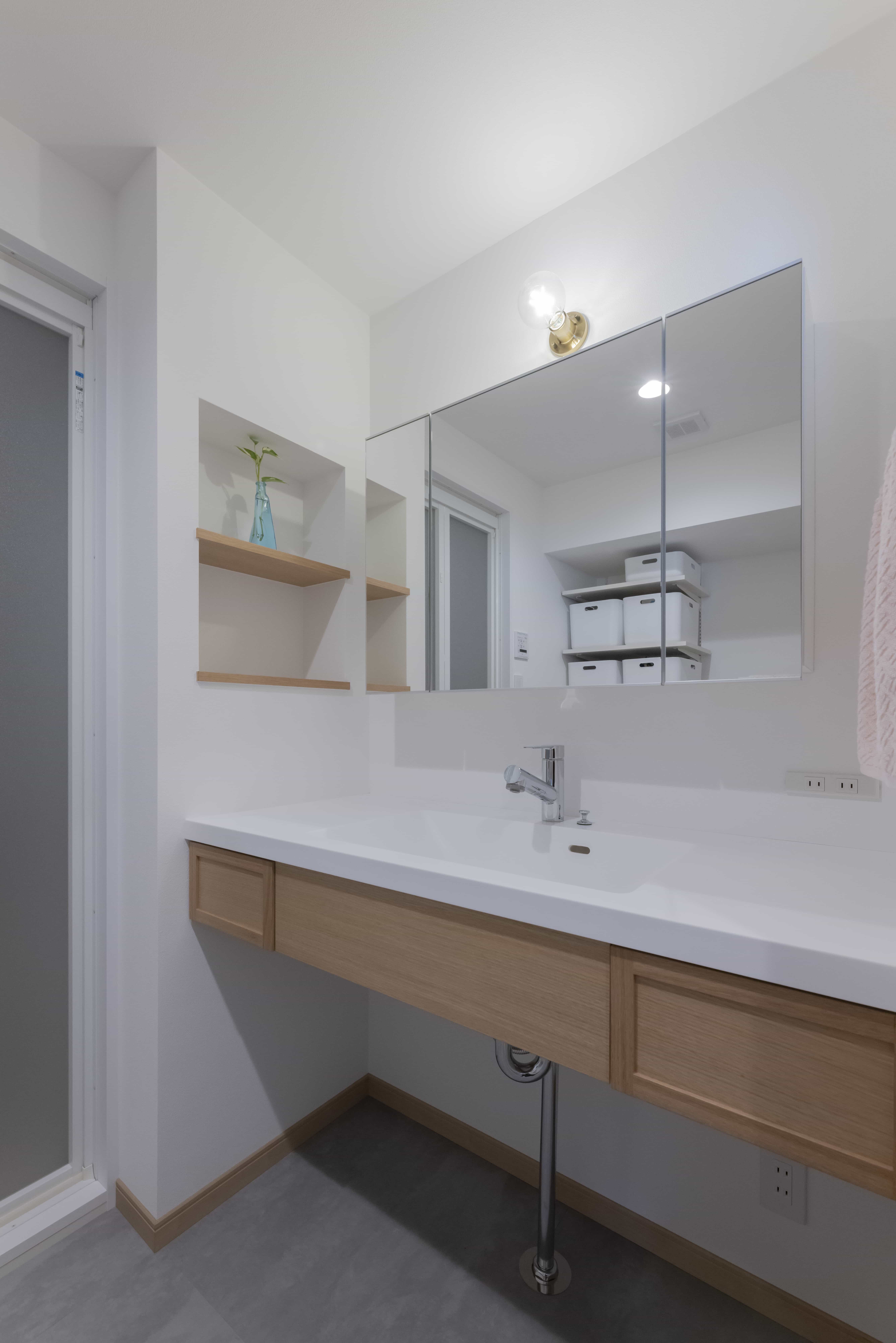 無印良品のオーク材を使用したTVボードをリノベーション後に取り入れたいというご要望を伺い、造作家具の素材をオーク材に統一。