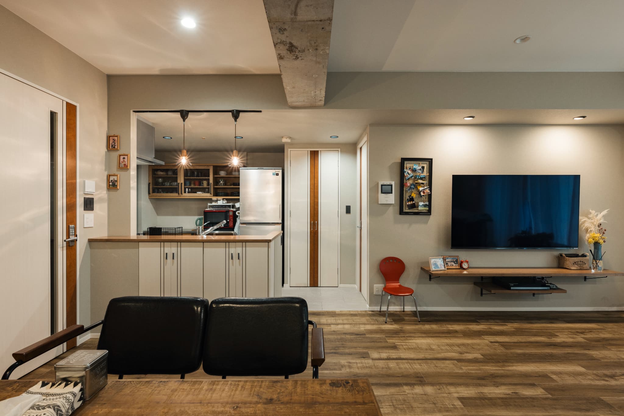 ベースの壁紙の色味をホワイト系からベージュ系に変更し、LDKの雰囲気がガラリと変わりました。