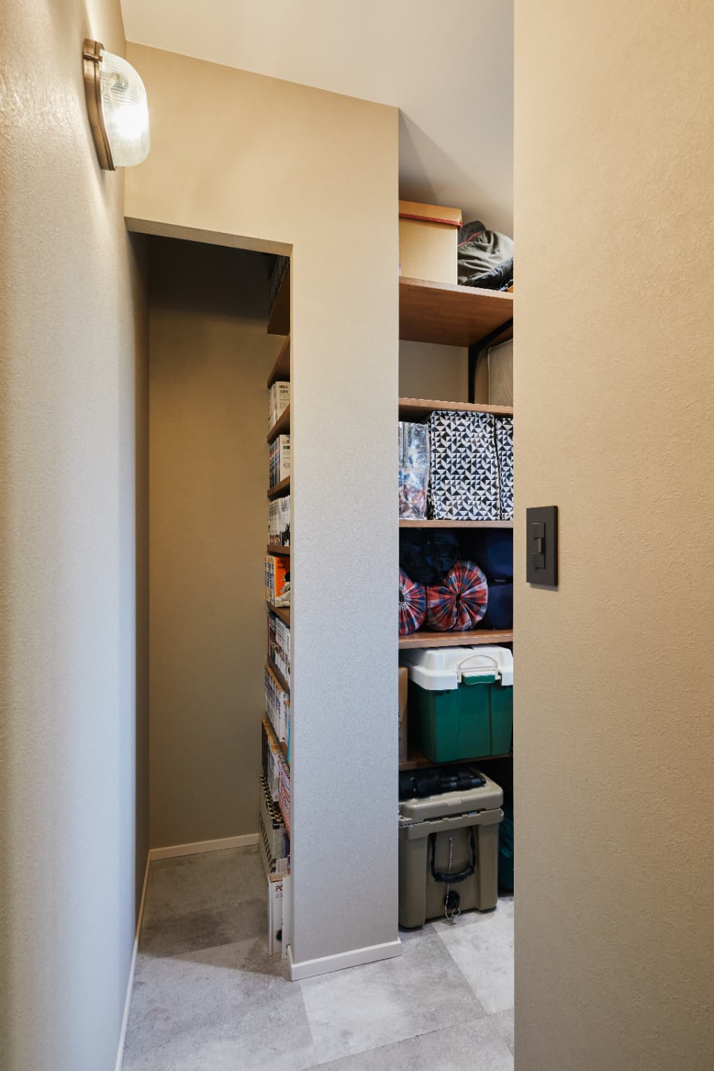 リビングに接した和室をなくし、一番の希望であった家族や友人が集まれる広々LDKを実現。バスケットボールや漫画など家族共通の趣味を反映させ、ロッカー風玄関収納や土間収納の一部を利用して本棚を造り付けました。こだわり満載で、毎日の暮らしをワクワクさせてくれます。