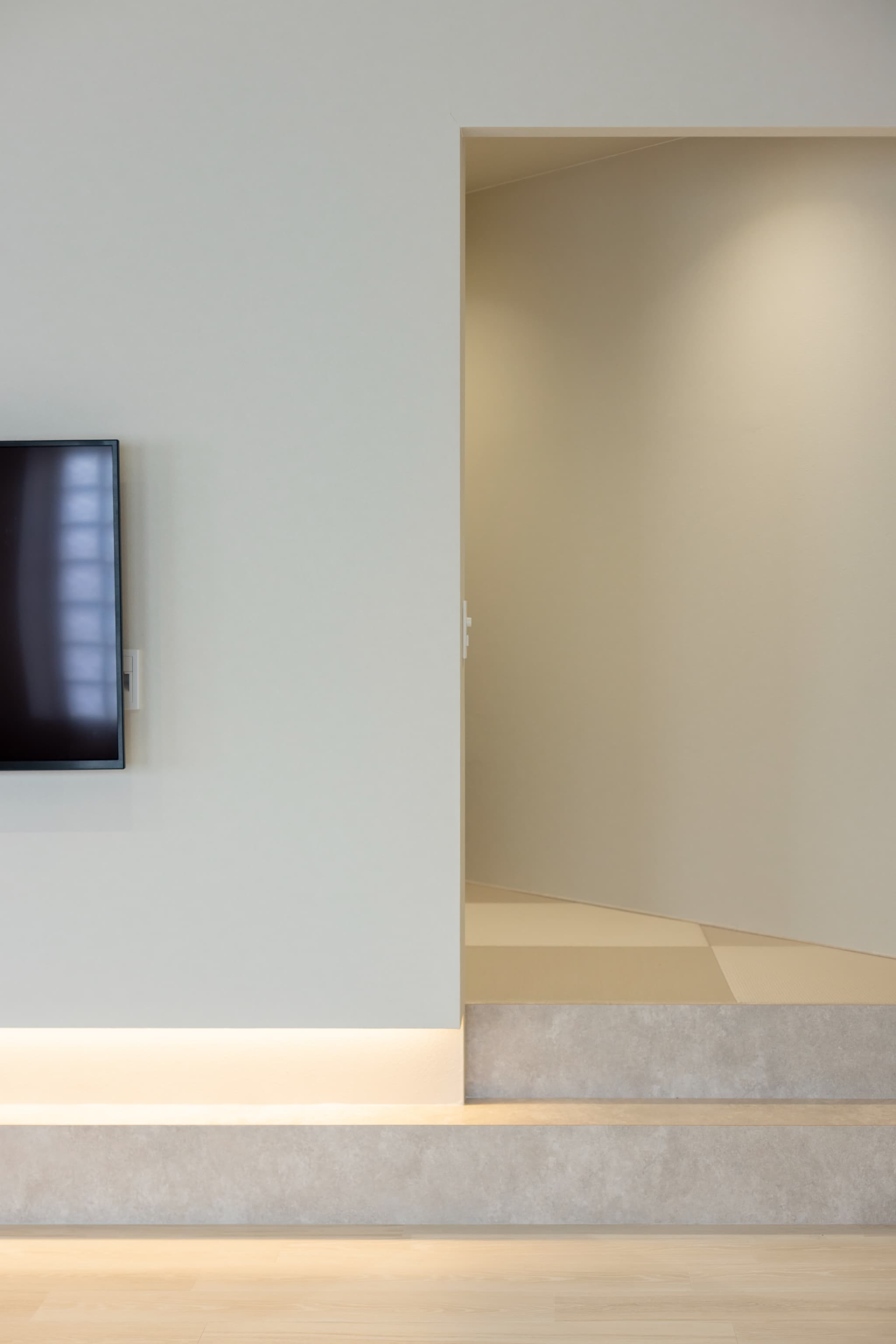 TV下部分に間接照明を配置することで空間にアクセントを加え、すっきりとした印象に。新たにガス式の床暖房を配置し、冬場でも快適に過ごすことができます。