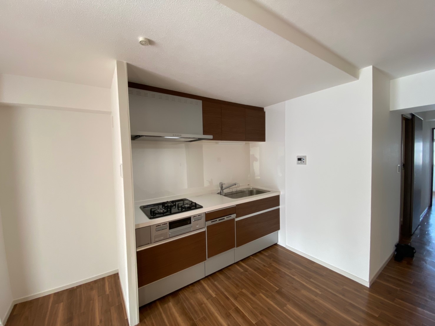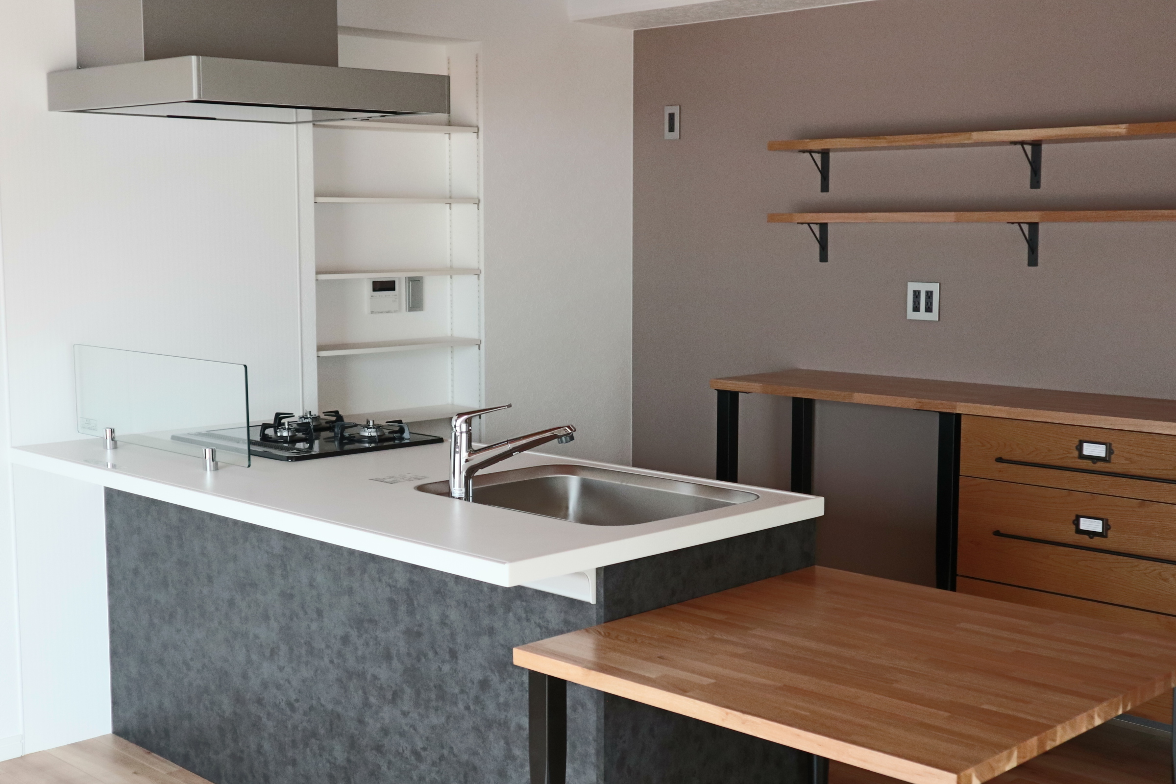 建築当時のキッチンは汚れが酷く設備の寿命も迎えていました。薄型レンジフードや人口大理石天板を採用することで、お掃除がしやすくキレイが続くキッチンへ。もちろん人気の食器洗乾燥機も装備しています。