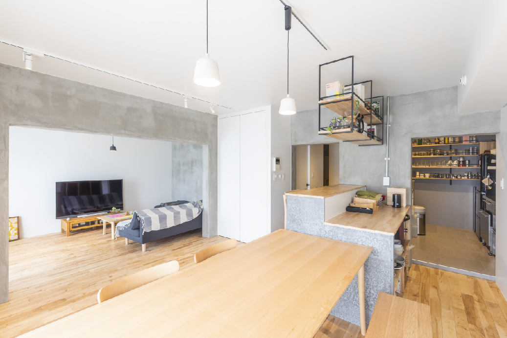 おうちがあるのは閑静な鎌倉エリア。海と山に囲まれた自然豊かな好立地。ご夫婦とも以前から鎌倉にお住まいで、周辺環境を気に入っていたそう。キッチンを中央に配した横長の2LDK。寝室とリビングの窓を開けると風が通り抜けるつくりです。建物の構造上、残す必要のあった壁はモルタル仕上げに。ダイニングから見ると、暮らしの風景がまるで額縁に入れた絵のように見えます。
