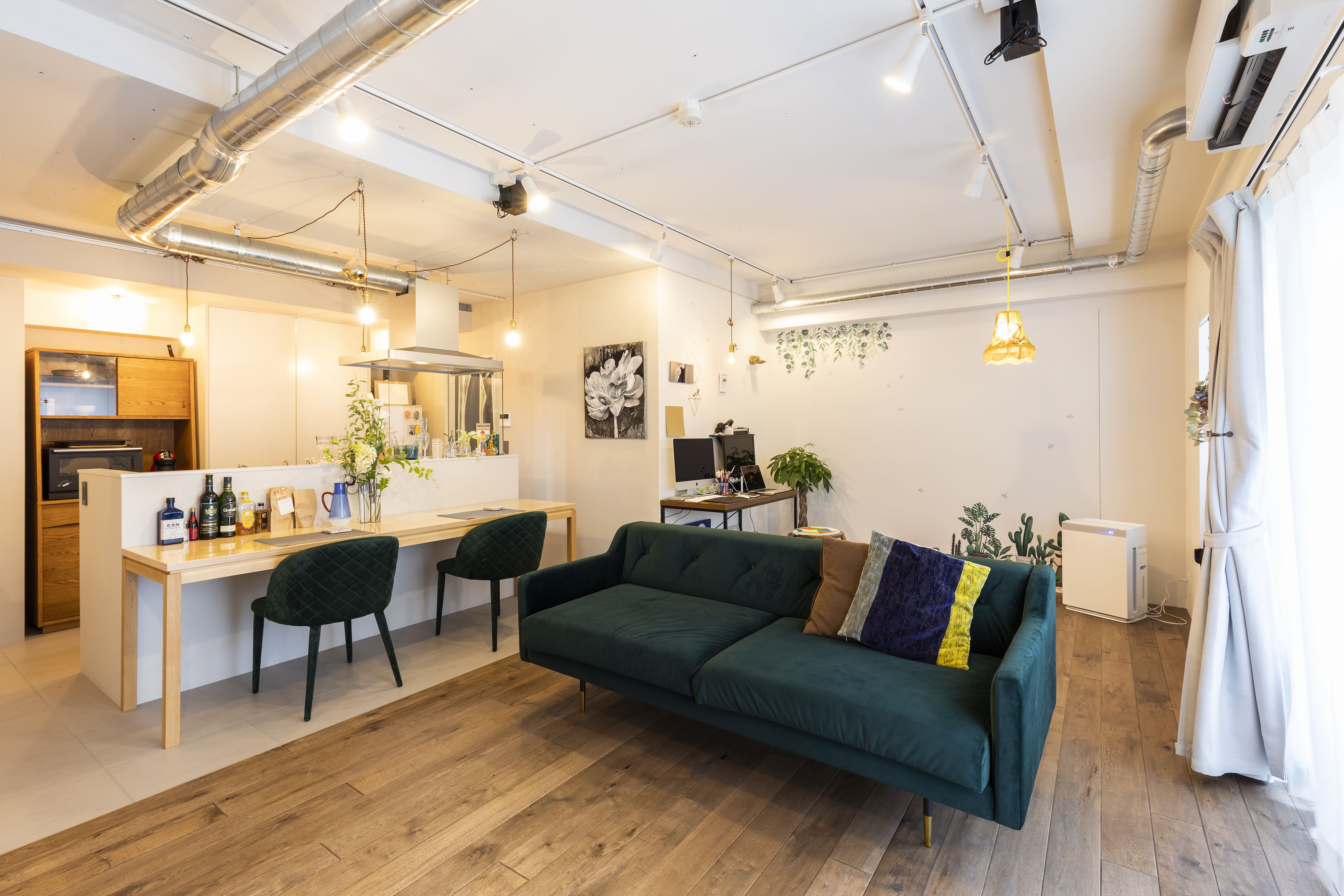 築10年ほどの中古マンションをフルリノベーションされたご夫婦とうさぎ1羽のファミリー。築浅物件を選ばれた理由は、将来の売り貸しの可能性を考慮してのことでした。お部屋全体を白、グレー、ゴールド・真鍮と彩度の低い色でまとめて美術館のようなイメージに。白壁部分は多趣味な夫人のキャンバスのようなスペース。絵画などご自身の作品を飾ったり、あえて残した真っ白なスペースを創造的に楽しんでいらっしゃいます。