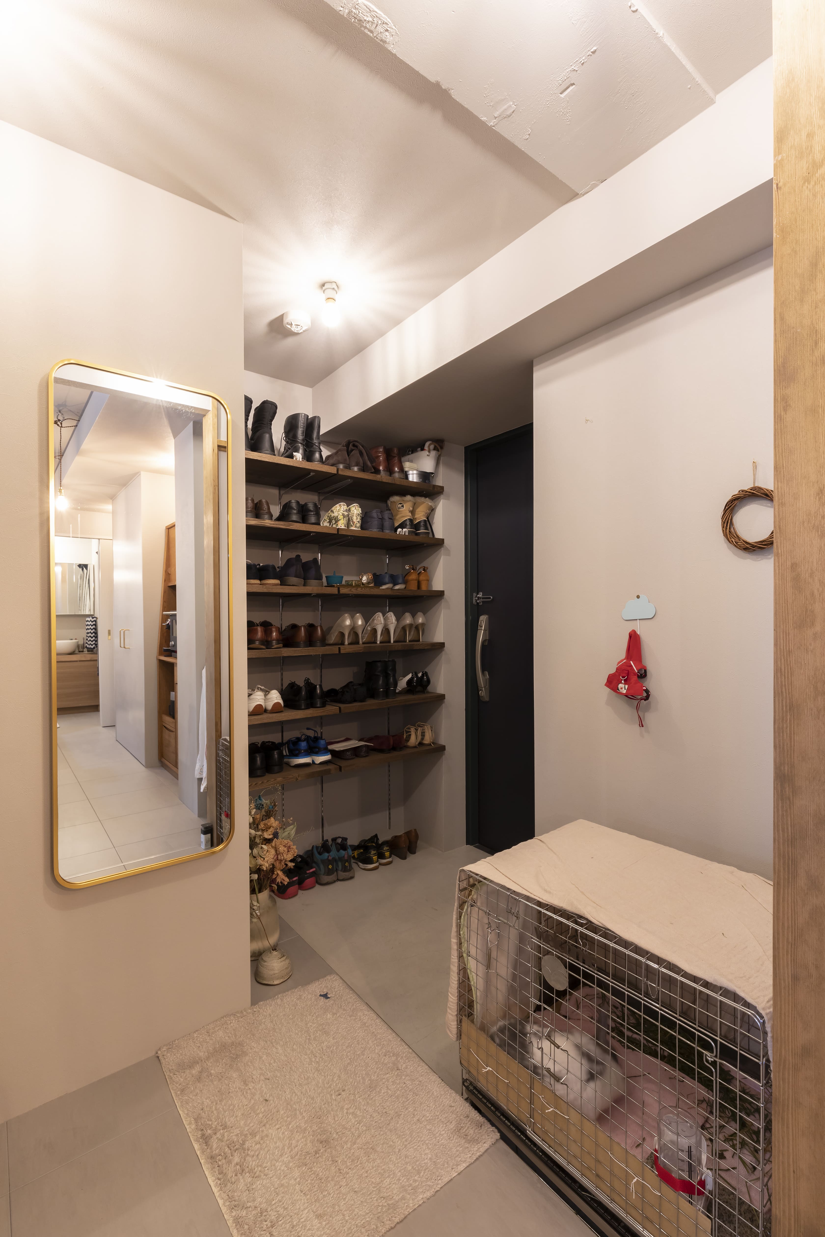 玄関土間のうさぎのケージもぴったりのサイズでプランしました。土間から一段上がった室内の床の高さをケージに合わせ、フラットで出入りがしやすい工夫がされています。また、ロフト下の収納と合わせると収納量は十分です。