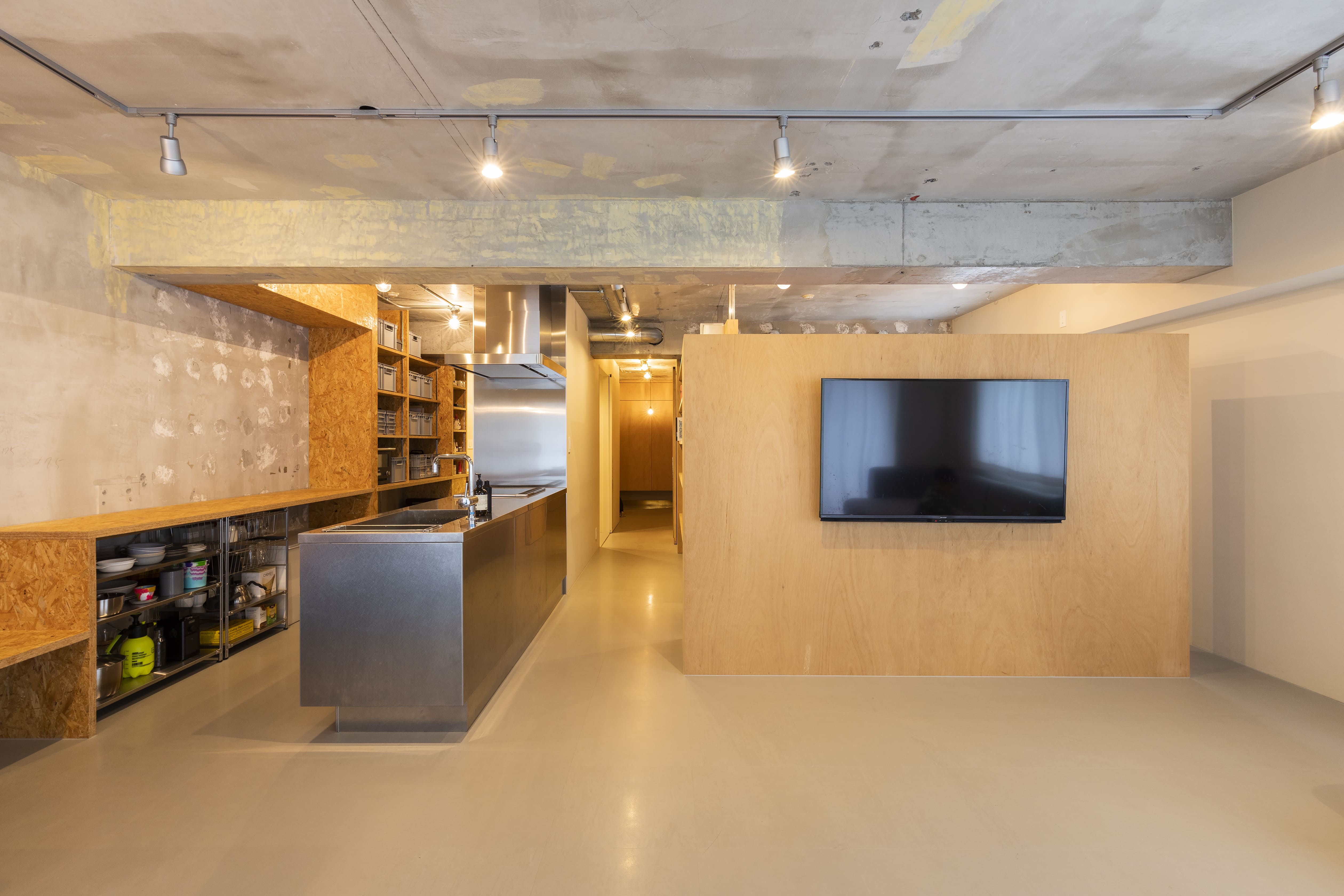壁の仕上げに使われているのは、構造用合板という下地に使用されることの多い素材。他にもフレキシブルボード、白の塗装、と異なる素材が絶妙なバランスで取り入れられています。仕上げ材を切り替えながら、全体で調和させる技ありのデザインです。
