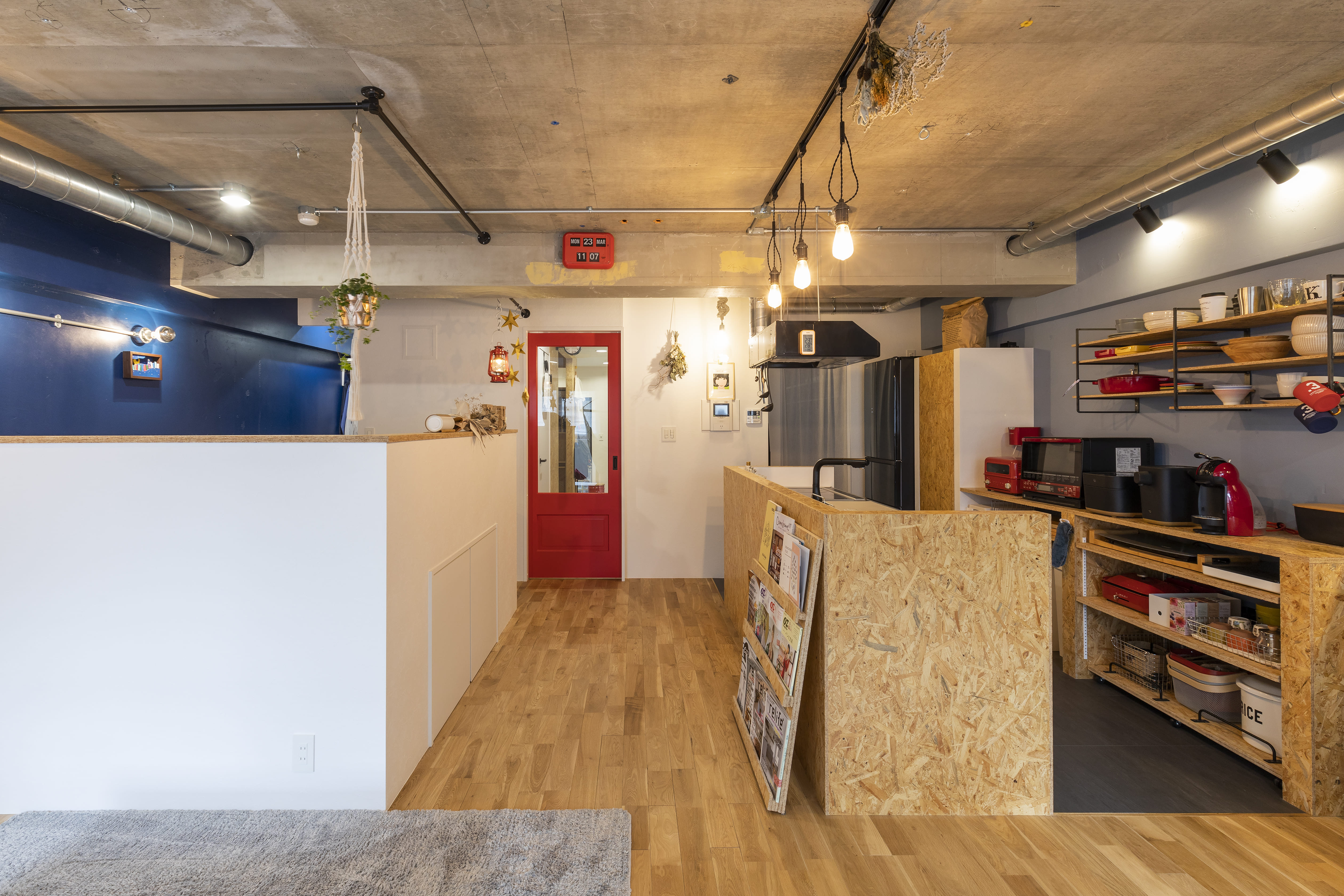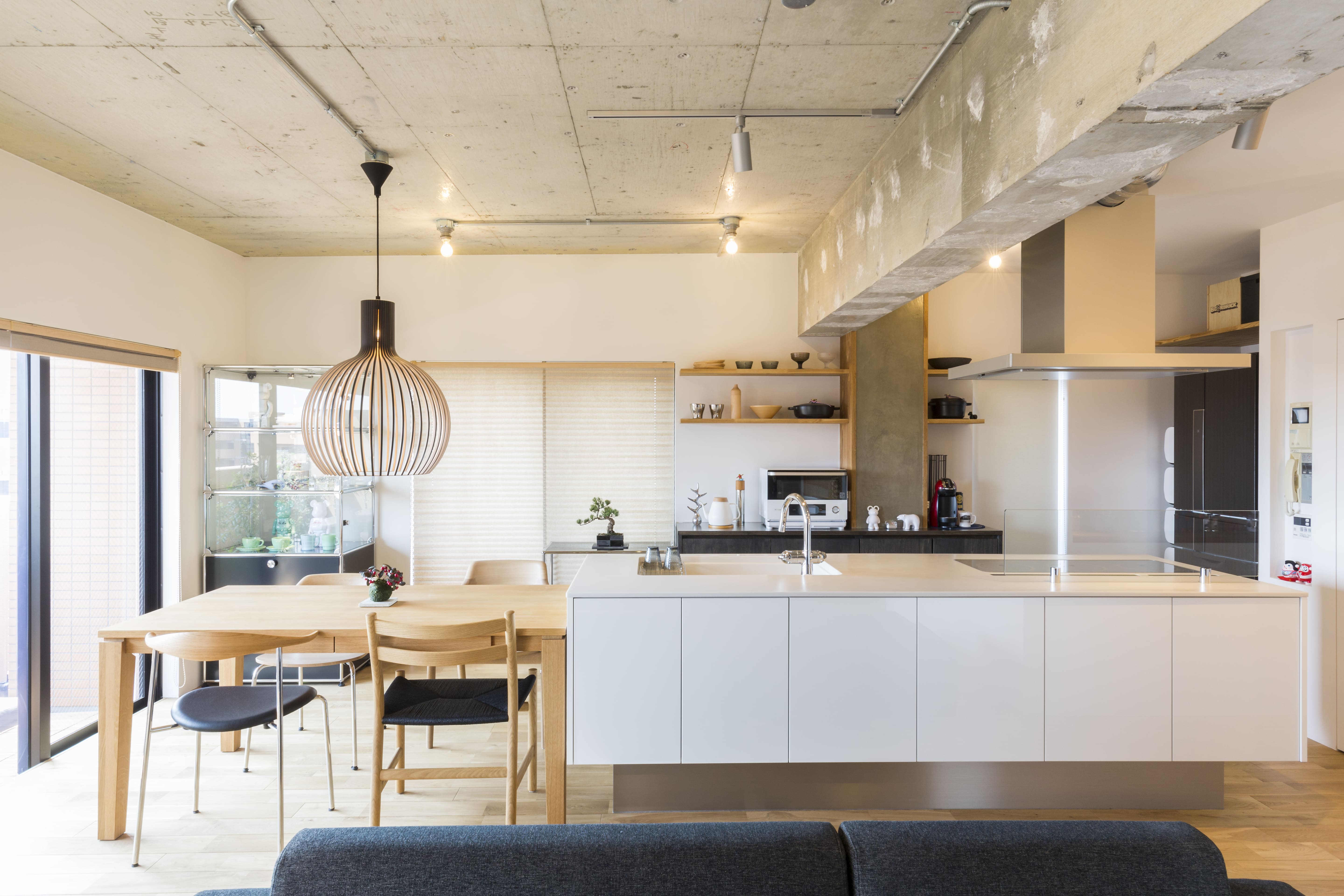 お住まいづくりのキーワードは「京都」「ホテル」「和モダン」の3つ。組子の建具や木製照明などのアイテムを取り入れる一方で、リビング壁にセラミックス素材タイルを取り入れ、天井はコンクリートあらわしにしたことで、空間全体がスタイリッシュな雰囲気に仕上がっています。