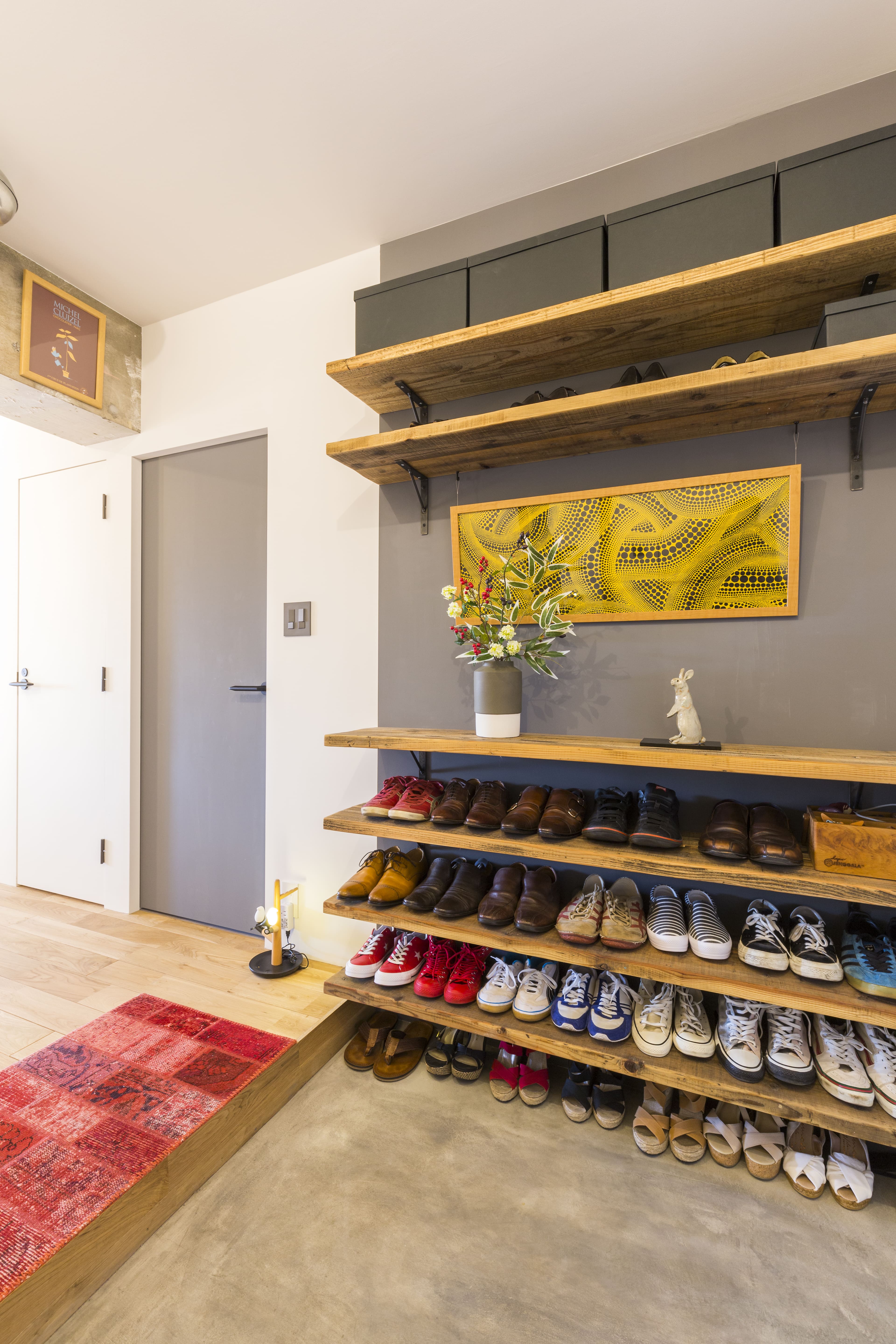 廊下には、夫人こだわりの間接照明付き飾り棚を設置。お気に入りのベアブリックや民芸品が並び、帰宅したご夫婦を出迎えます。玄関のシューズ棚の背面の色選びにはちょっとしたこだわりがあり、汚れが目立たないグレーを選択。靴を収納する際に擦れて汚れが目立つのを押さえる効果があります。背面の色にあわせて、ウォークインクローゼット(WIC)の扉もグレーで統一しています。