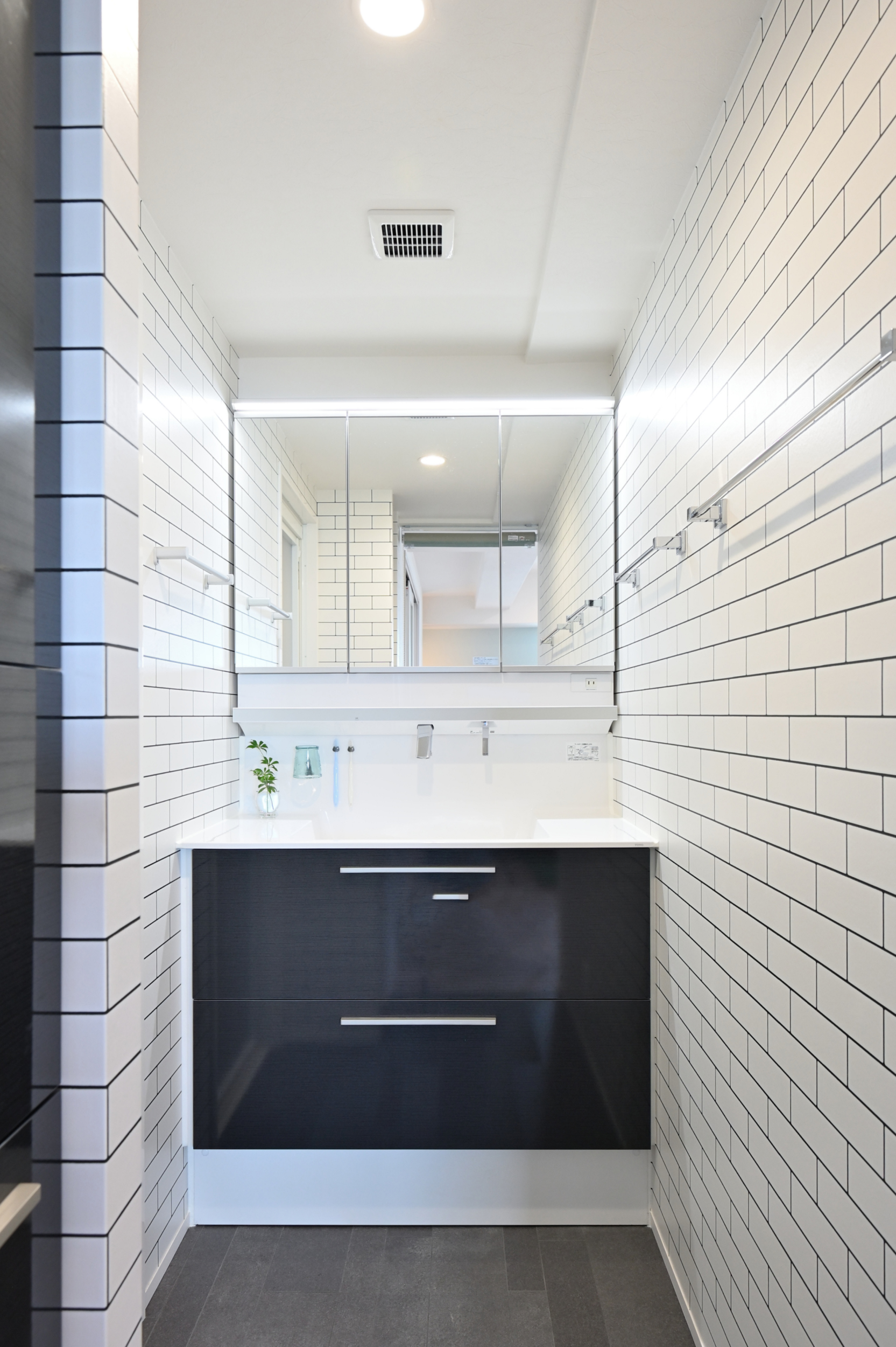 洗面室は、洗面化粧台の面材に黒、壁は白のタイル柄を選び、ホテルを思わせるシックな空間に仕上げました。床は素足で歩くのが気持ちよいクッションフロアとしました。