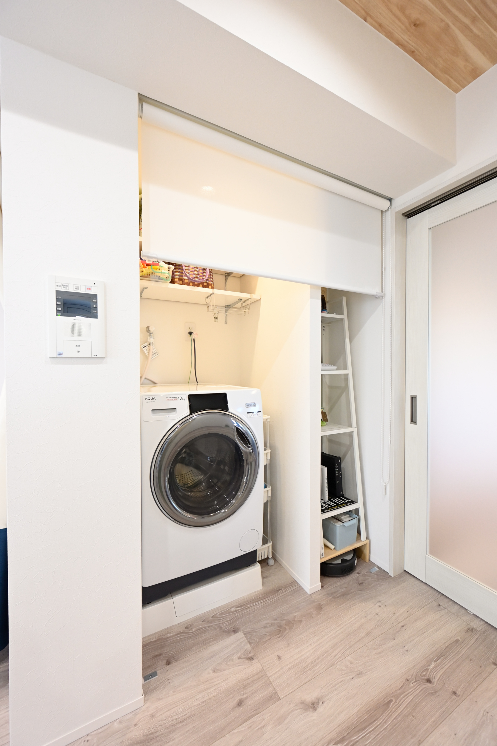 これまで洗面室に置いていた洗濯機は、新たに専用のスペースを設けました。キッチン、ベッドルームとの距離も近くなり、より効率的に家事ができるようになりました。収納にはロボット掃除機の充電スペースも確保。間仕切りには、全開時もコンパクトで場所を取らないロールスクリーンを採用しました。