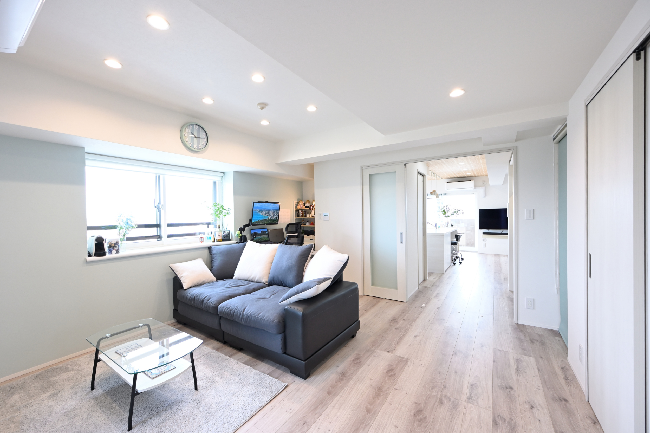 築25年のマンションにお住まいのHさま。壁を減らして可変的かつ風通しをよくしたい、キッチンを明るくしたいとのご要望を受け、まずは仕切りがほとんどない開放的な間取りをご提案しました。また、ご夫婦ともに在宅でお仕事をされるため、それぞれのワークスペースを設け、集中できる環境を整えました。お部屋に出ていたものは、なるべくウォークインクロゼットに収めて、より開放感を感じられるように、建具に引き戸やロールスクリーンなどを取り入れることで、すっきりと風通しのよい開放的な住まいとなりました。
