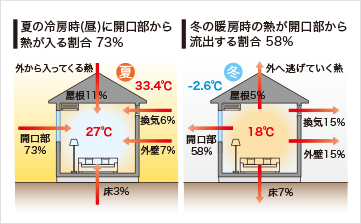 開口部(窓および玄関ドア、勝手口ドアなど)から出入りする熱は、下図にもあるように非常に割合が高いのです。