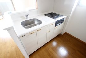 | キッチン | ガスコンロ対応、システムキッチン、2口コンロ、対面式キッチン、キッチンに窓、都市ガス |