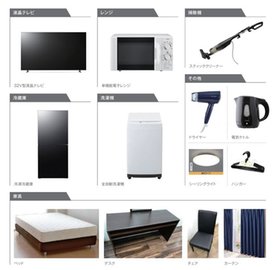 | 家具・家電 | 照明付、冷蔵庫、洗濯機、電子レンジ、ベッド、家電付、家具付、カーテン付、全室照明付、テレビ |