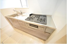 | キッチン | ガスコンロ対応、システムキッチン、3口以上コンロ、対面式キッチン、都市ガス |