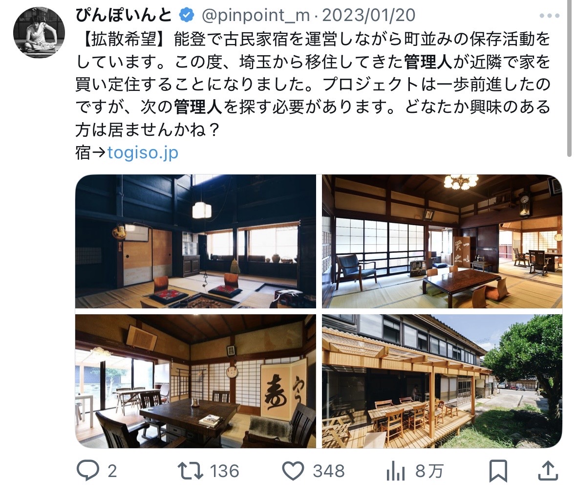 はじめは能登じゃなくても良かった。どこでもいいから海の近くで暮らしてみたかった。あわよくばそこで仕事があればいいな、くらいの気持ちだった。そんな漠然とした思いを抱えていた頃、X(当時はTwitter)で突然TOGISOのオーナーの投稿が流れてきた。